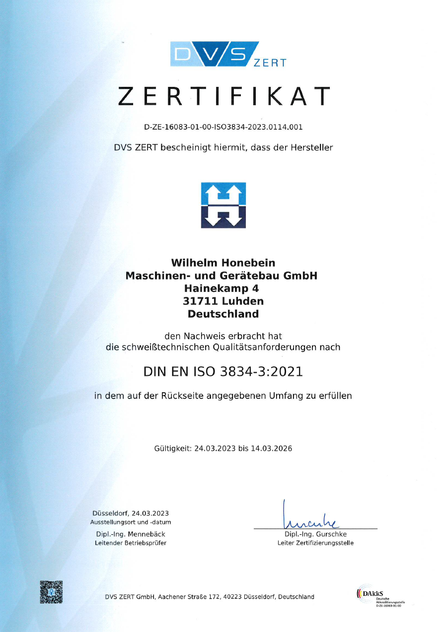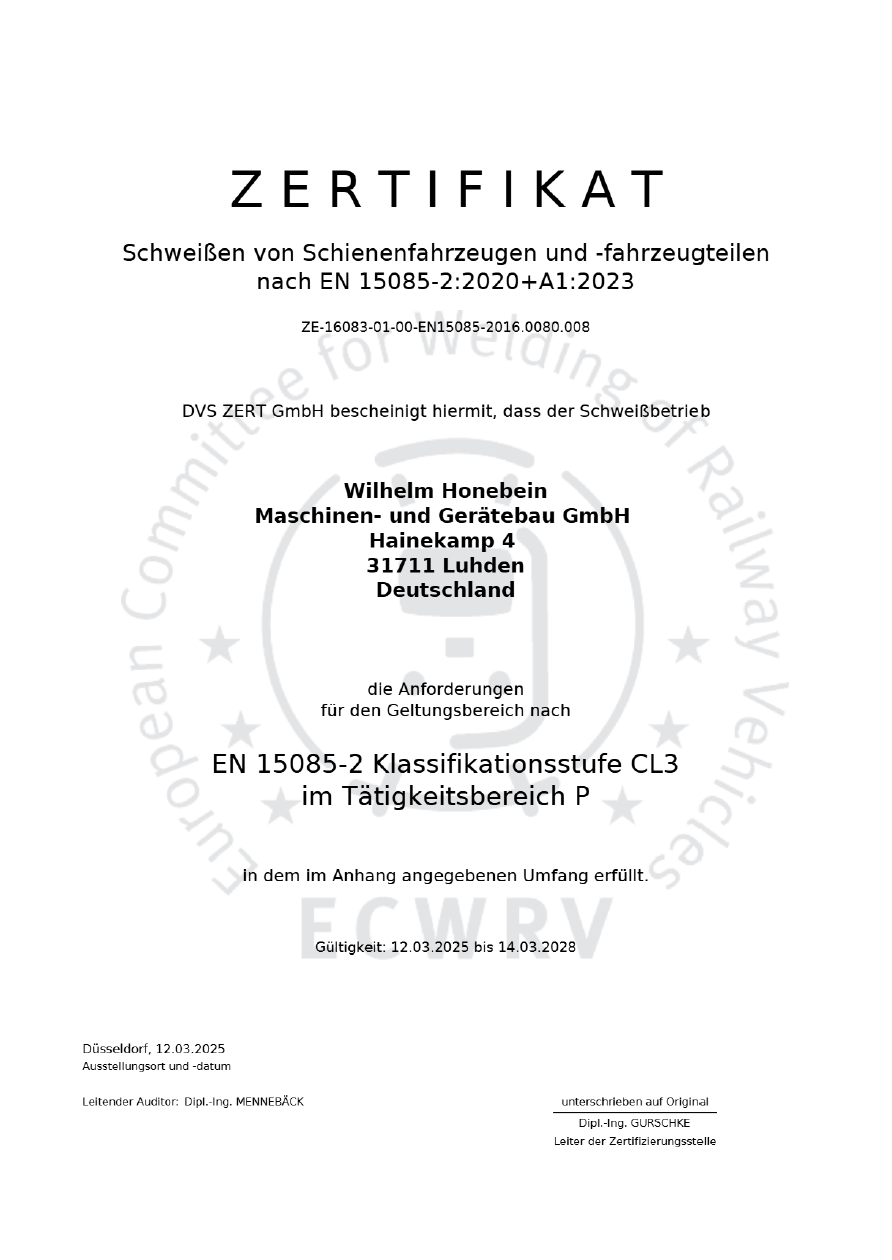 Honebein verfügt weiterhin über die Schweißzertifikate DIN EN ISO 3834-3 (schweißtechnische Qualitätsanforderung) und DIN EN 15085 CL3 (Schweißen von Schienenfahrzeugen und -fahrzeugteilen).